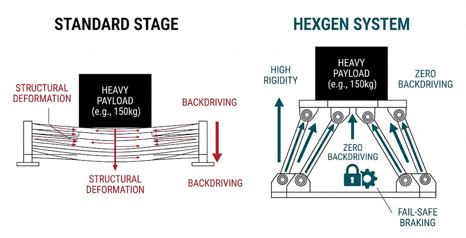 重載平台對比圖:HexGen系統展現卓越剛性與零掉落技術,完美克服標準平台的結構變形與失速風險。