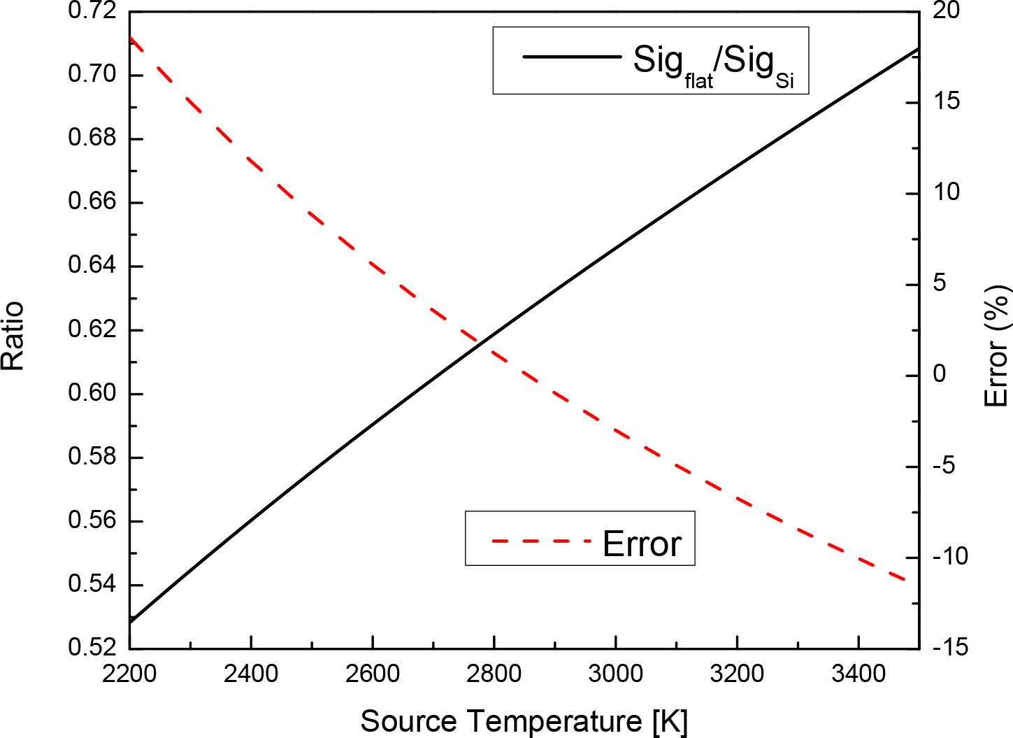 圖 2 非常清晰地展示了,在一個理想光源,即其發射光譜完全遵循普朗克黑體輻射定律的前提下,於一系列不同的光源操作溫度條件中,採用上述兩種方法(平坦響應積分與矽響應積分)分別計算得到的偵測器理論訊號值,兩者之間的比例是如何隨溫度而變化的。從該圖的曲線趨勢可以明確看出,如果在一個實際的測試系統中,使用了一個未經其自身光譜響應特性校正的非平坦響應偵測器,例如:一個普通的裸矽偵測器,作為閉迴路控制系統中的回饋偵測器,那麼,僅僅因為光源本身溫度的微小變化所導致的上述偵測訊號計算比例的改變,就將直接導致整個系統在設定和回饋控制光源輻射亮度時產生不可忽略的誤差。