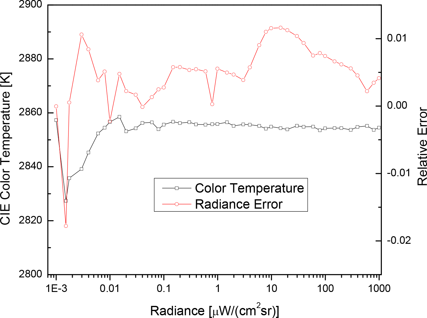 從圖 5 的數據可以非常明顯地看出,經過有效的光譜校正之後,系統輸出色溫隨亮度變化的幅度得到了極為顯著的抑制與大幅度的減少。原先在未校正狀態下觀察到的、超過 100 K 的巨大色溫波動範圍,在實施了光譜校正之後,於整個動態範圍內,其輸出色溫相對於 2856 K 這一額定值的最大偏差,已被成功地控制在僅僅 27 K 以內。這一結果無疑極大地提升了光源輸出光譜的一致性與可預測性。此外,從圖中數據點的離散程度或可能存在的誤差棒(若有顯示)亦可觀察到一個現象:即在輻射亮度輸出範圍的極低端,也就是光線極為微弱的條件下,色溫量測結果本身所具有的誤差或不確定度有一定程度的增加。這主要是由於在這些極端低光照的測試條件下,用於進行參考量測的外部高精度光譜輻射計,其內部感光元件所能接收到的有效光訊號強度變得非常微弱,這直接導致了儀器內部電路的訊噪比顯著下降,進而影響了後續基於光譜數據計算色溫值的準確性與可靠性。