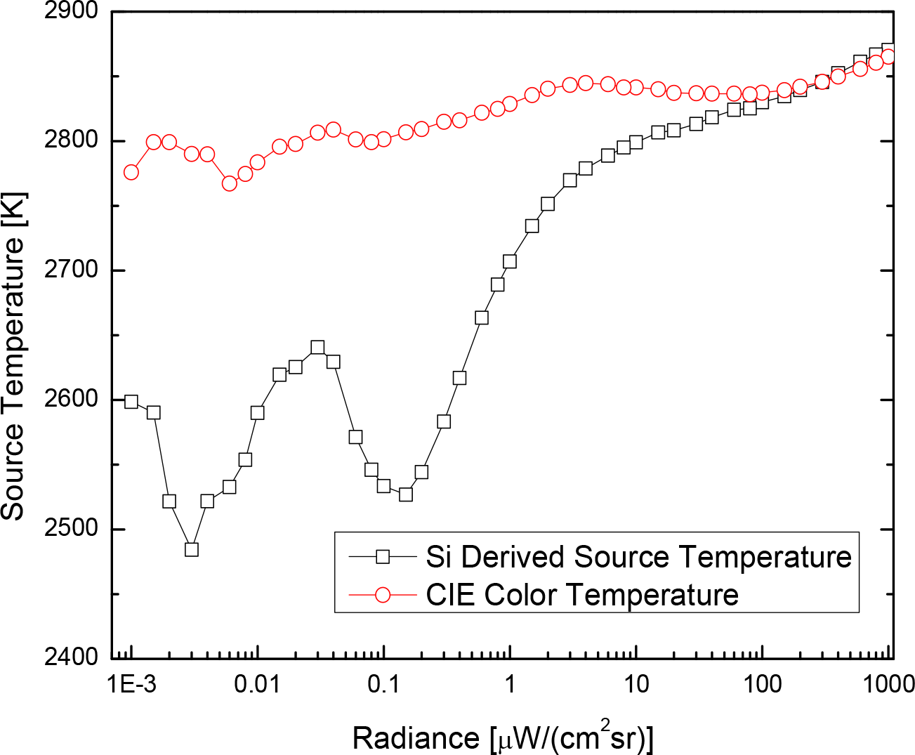 圖 7 VEO-2 中的光源溫度變異,矽推導溫度已校正至與 1000 µW/(cm²sr) 時的 CIE 溫度相符,此系統使用的校正遵循 CIE 色溫。
