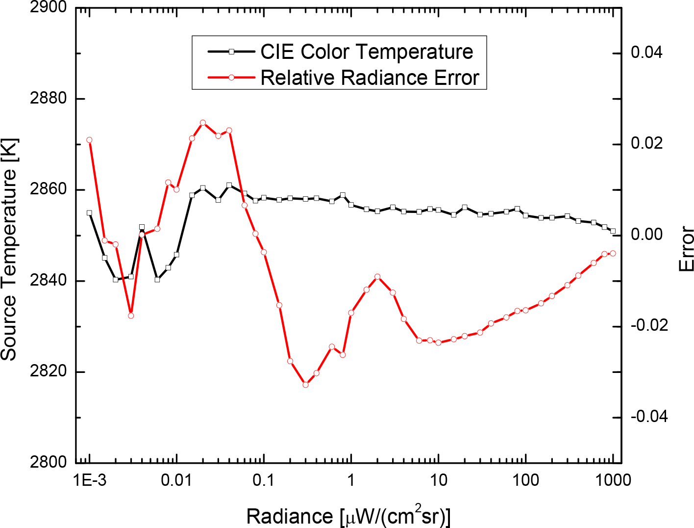 圖 8 VEO-2 校正後的輻射亮度誤差與色溫,由於圖 9 所示的輕微光譜變異,無法達到與 VSX 相似的結果。