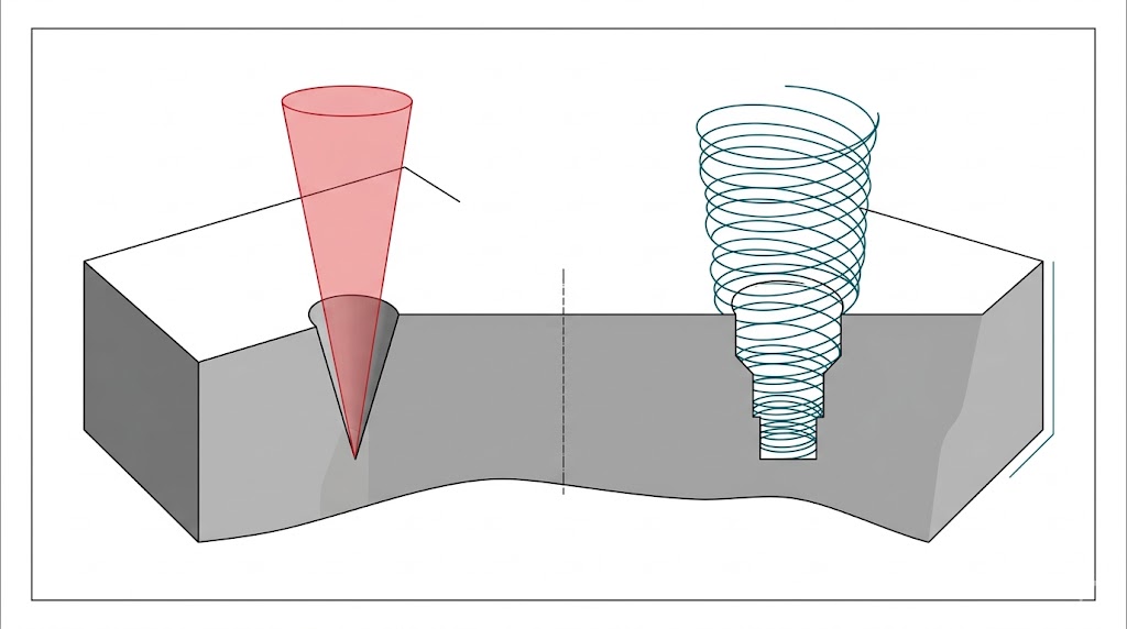 技術對比:左側傳統五軸因抖動產生跟隨誤差與錐形孔瑕疵;右側 AGV5D 則運用高頻光束進動,精準加工出直壁、無錐度圓柱孔,且零熱影響。