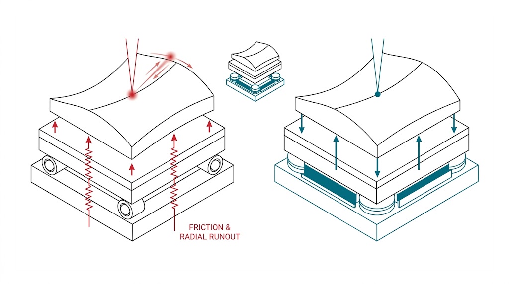 大型曲面加工中,滾珠軸承摩擦偏擺致焦點模糊、幾何失真;氣浮軸承零接觸,確保亞微米級穩定焦點與高輪廓精度。