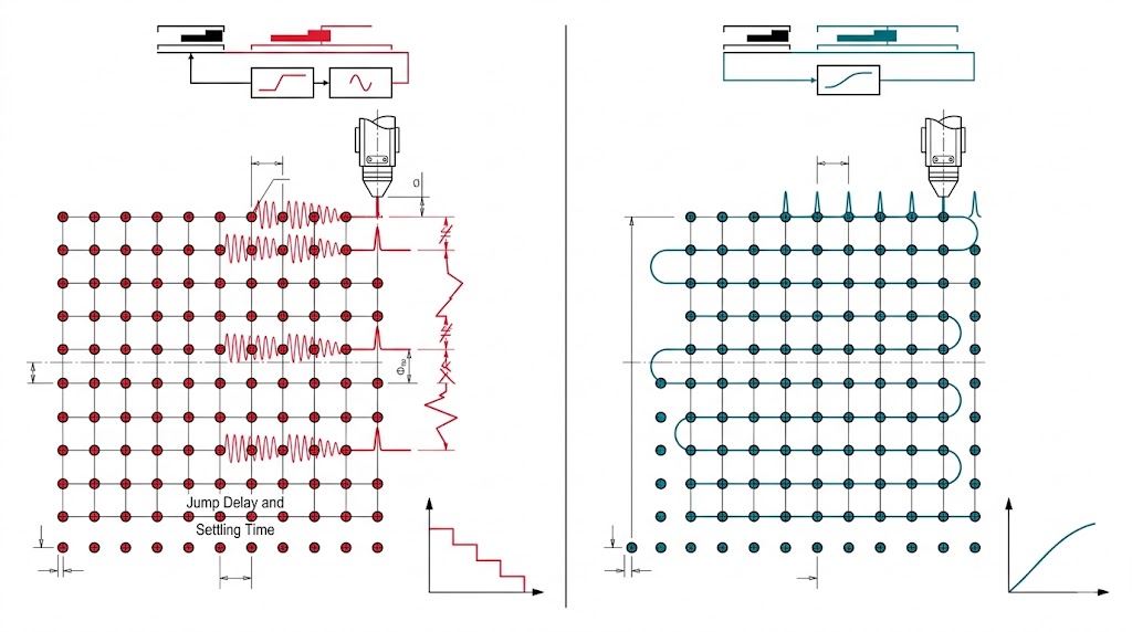 最後一個致命傷在於巨量生產的時間成本,傳統的加工邏輯是「步進與重複(Step-and-Repeat)」:巨觀滑台將雷達罩移動到目標位置 → 煞車並等待震動消散(整定時間 Settle Time)→ 啟動雷射鑽一個孔 → 移動到下一個位置,當一片透波外殼上佈滿了數百萬個冷卻孔時,這動輒幾百毫秒的「整定延遲(Jump Delay)」會被放大數百萬倍,原本只需幾何秒鐘的雷射擊發時間,卻因為永無止盡的機械等待,導致單一航太零件的加工時間飆升至數週之久,徹底摧毀了國防供應鏈的量產彈性。