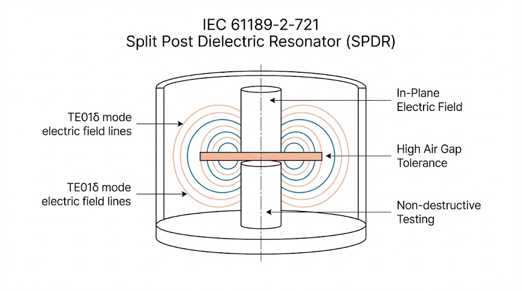 IEC 61189-2-721 明確指定使用 分裂柱介電諧振器 (Split Post Dielectric Resonator, SPDR) 作為測試治具,這項選擇基於其獨特的物理特性,能有效解決傳統傳輸線法或電容法在高頻測試中的痛點。