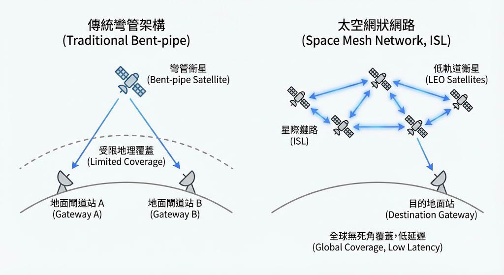 在傳統的衛星通訊架構中,衛星僅是「彎管(Bent-pipe)」,負責將訊號從地面 A 點反射到地面 B 點,這種架構依賴大量的地面閘道站(Gateway),且受限於地理位置(如海洋中無法建站),然而隨著 低軌道(LEO)巨型星座 的興起,一場名為 「星際鏈路(Inter-satellite Link, ISL)」 的革命正在重塑太空通訊的定義。