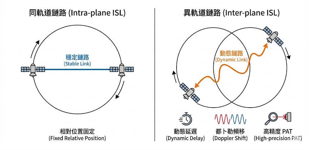 同一軌道面上的衛星相對位置較為固定,鏈路較穩定。 - 異軌道鏈路(Inter-plane ISL):