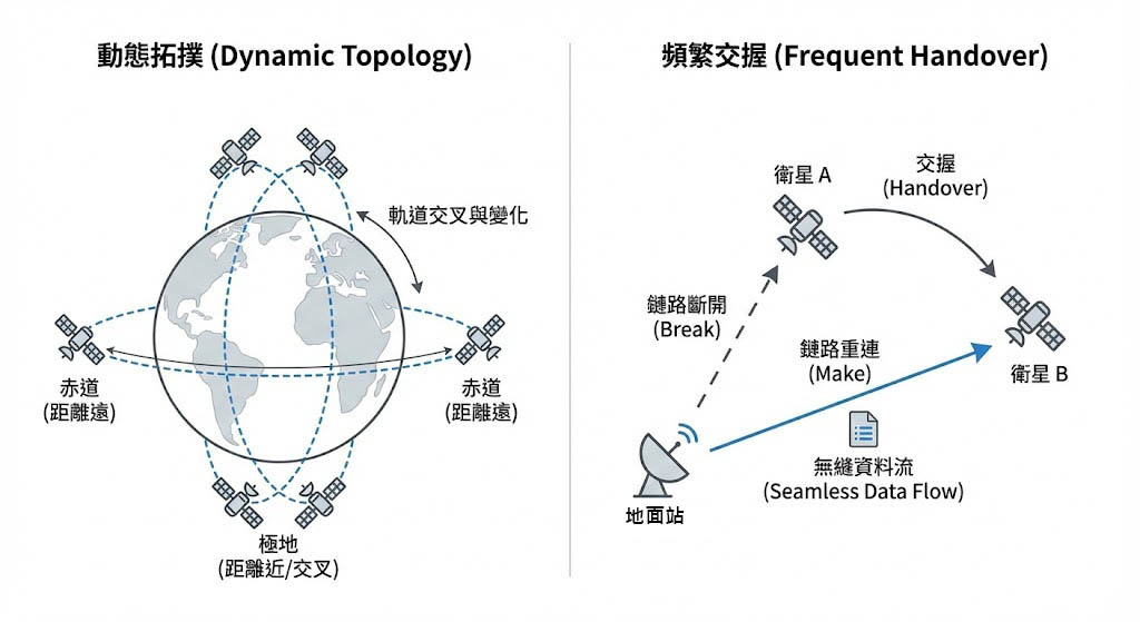 由於地球是球體且軌道會交叉(例如在極區),星座的網路拓撲是隨時間動態變化的(Time-Varying Topology)。