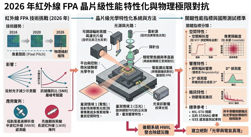 進入 2026 年,紅外線焦平面陣列(FPA)的半導體製程已逼近物理繞射極限,無論是應用於低軌衛星的高解析度中波紅外線(MWIR)感測器,或是先進戰術莢艙的長波紅外線(LWIR)陣列,像素間距(Pixel Pitch)已大幅微縮,當像素尺寸縮小,單一像素所能接收到的光子數量急遽減少,這使得感測器的訊號雜訊比(SNR)面臨嚴峻考驗。