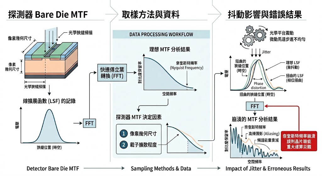 實務上量測探測器 MTF 的方法,是將一個極其狹窄的光學狹縫(Slit)影像,聚焦並緩慢掃描過感測器的一個或多個像素,測試系統會記錄像素輸出電壓隨著狹縫位置變化的資料,這條曲線在數學上被稱為邊緣響應或線擴展函數(Line-spread Function),接著系統必須對這條曲線進行快速傅立葉轉換(FFT),以得出不同空間頻率下的對比度保留率。 這裡的運算災難在於「取樣頻率的抖動」,如果在狹縫掃描的過程中,光學平台的震動或是微動馬達的步進不均勻,會導致擷取到的線擴展函數在時間與空間軸上產生相位扭曲,當這組帶有相位扭曲的資料進入傅立葉轉換演算法時,會產生嚴重的高頻假影(Aliasing)與頻譜能量衰減,導致計算出的 MTF 曲線在奈奎斯特頻率(Nyquist Frequency)附近發生崩潰,讓工程師誤判晶片的製程存在重大瑕疵。