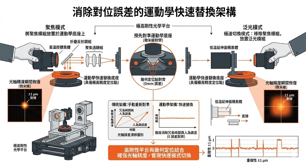 為了消滅設備轉換時的對位誤差,系統必須建立在一個具備極高剛性的光學平台上,其配置核心在於全面導入「快速替換運動學安裝座(Quick-change Kinematic Mounts)」,在這種架構下,無論是高溫腔體黑體、低溫延伸面積黑體,或是聚焦透鏡組與折疊反射鏡,其底部都具備極高精度的幾何定位點,這使得系統能夠在「聚焦模式」與「泛光模式」之間進行極速切換,工程師只需將模組放置於預先對準的運動學底座上,即可確保光軸精度瞬間恢復至微米級別,徹底消除了重新對準的冗長時間與人為誤差。