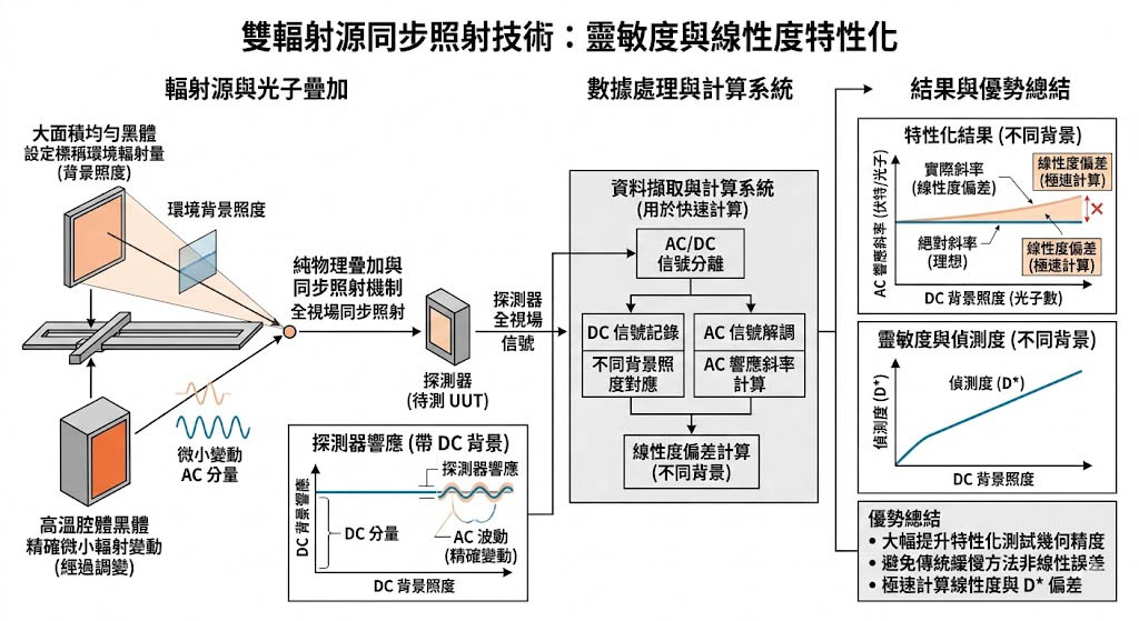 在評估探測器極限靈敏度(D*)與響應線性度時,傳統改變單一黑體溫度的方法過於緩慢且容易產生非線性誤差,高階系統配置邏輯是採用「雙輻射源同步照射技術」,利用光學導軌,系統同時配置一個涵蓋探測器全視場的大面積均勻黑體(設定標稱環境輻射量),以及一個經過調變的高溫腔體黑體,高溫源提供一個精確且可重複的微小輻射變動量(AC 分量),疊加在泛光背景上,透過這種純物理的光子疊加機制,系統能極速計算出探測器在不同背景照度下的絕對斜率與線性度偏差,大幅提升基礎特性化測試的幾何精度。