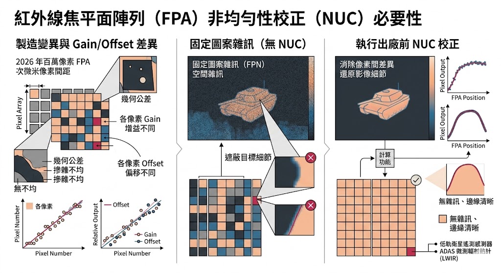 進入 2026 年,紅外線焦平面陣列(FPA)的硬體架構已達到次微米級別的像素間距極限,不論是應用於低軌衛星遙測的高解析度中波紅外線(MWIR)感測器,或是先進駕駛輔助系統(ADAS)中的長波紅外線(LWIR)微測輻射熱計(Microbolometer),百萬像素等級的陣列已成為業界標配,然而半導體材料在磊晶生長與微影蝕刻過程中,無可避免地會產生微觀的幾何公差與摻雜不均,這些製造上的變異,導致陣列中的每一個像素對相同紅外線輻射的「響應增益(Gain)」與「暗電流偏移(Offset)」都存在微小的個體差異。