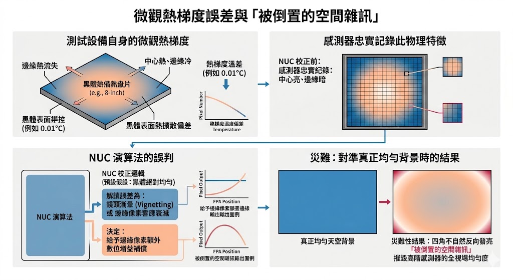 實務上的災難在於,要製造一個面積高達八英吋甚至十四英吋的大型金屬發射板,並確保其表面每一個點的溫度完全一致,是一項對抗熱力學極限的挑戰,傳統黑體加熱板邊緣通常會因為與周遭空氣的對流作用而產生微小的熱量流失,導致中心溫度高於邊緣溫度(即熱梯度現象),當工程師使用一個表面存在百分之一攝氏度溫差梯度的黑體來執行 NUC 時,感測器會忠實地將這個「中心亮、邊緣暗」的物理特徵記錄下來,NUC 演算法會誤以為這是感測器鏡頭的漸暈(Vignetting)或是邊緣像素的響應衰減,進而給予邊緣像素額外的數位增益補償。 結果是災難性的:當這台經過「校正」的熱像儀對準真實世界中真正均勻的天空背景時,由於邊緣像素被過度補償,影像的四個角落會出現極不自然的「反向發亮」現象,這種由測試設備自身熱梯度引起的倒置空間雜訊,直接摧毀了高階感測器的全視場均勻度。