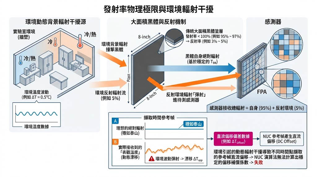 在進行高精度的 NUC 校正時,我們只希望感測器接收到由黑體溫度決定的絕對輻射量,然而傳統的大面積黑體塗層(如高溫黑漆)在中長波紅外線頻段的發射率通常只能達到百分之九十五至百分之九十七,這看似微小的百分之三到百分之五的反射率,在毫開爾文級別的校正中是致命的,假設實驗室內的空調系統啟動,導致周遭牆壁或設備的環境溫度產生了半度的波動,這半度的冷熱變化會瞬間撞擊黑體表面,並被那百分之五的反射率「彈射」進待測的感測器中。此時,黑體自身的溫度控制雖然穩如泰山,但感測器接收到的「表觀溫度(Apparent Temperature)」卻因為環境反射而發生了漂移,這種由環境引起的動態輻射干擾,會導致不同時間點擷取的 NUC 參考幀產生微小的直流偏移(DC Offset),讓演算法無法計算出穩定的偏移補償係數。