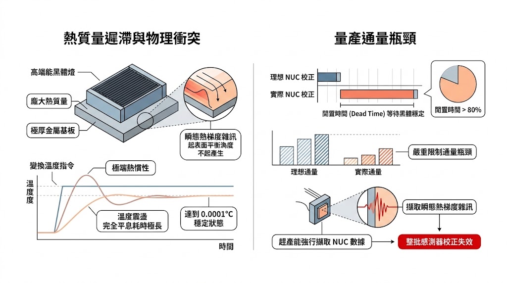 這裡的物理衝突在於「溫度穩定度」與「溫度變換速度」的拉鋸,為了確保大面積輻射板的溫度絕對均勻且不受氣流干擾,高階黑體必須具備極大的熱質量(金屬基板極厚且重),但龐大的熱質量意味著極端的「熱慣性」,當系統指令黑體從二十度加熱到六十度時,傳統設備可能需要耗費數十分鐘才能讓溫度的微小震盪(Overshoot)完全平息,達到規範要求的萬分之一度穩定狀態,在量產線或高通量驗證環境中,等待黑體穩定所耗費的閒置時間(Dead Time),往往佔據了整個測試週期的百分之八十以上,若為了趕產能而在黑體尚未完全達到熱平衡時就強行擷取 NUC 數據,將會捕捉到瞬態的熱梯度雜訊,導致整批感測器校正失效。