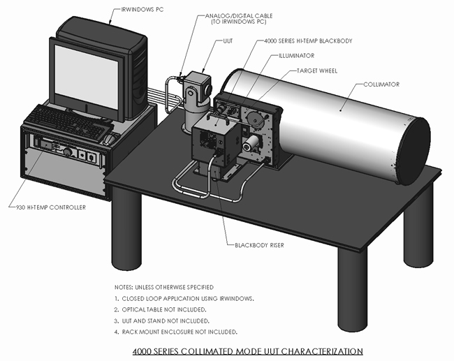此圖展示一套完整的 SBIR 4000 系列準直模式待測物 (UUT) 特性分析系統配置,系統核心包含安裝於黑體支架上的 4000 系列高溫黑體、可切換圖樣的目標輪及輔助照明器,其產生的輻射能量經由大型準直儀轉換為平行光束,用以精確照射並評估 UUT(如紅外線攝影機或感測器)的各項性能指標;4000 系列高溫控制器提供穩定的溫度控制,而 IRWindows PC 則透過介面纜線(類比/數位訊號)實現系統整合控制、閉迴路應用程式操作及最終的資料擷取與分析。此設置是實驗室進行高精度紅外線元件或系統校準與特性化的典型解決方案。
