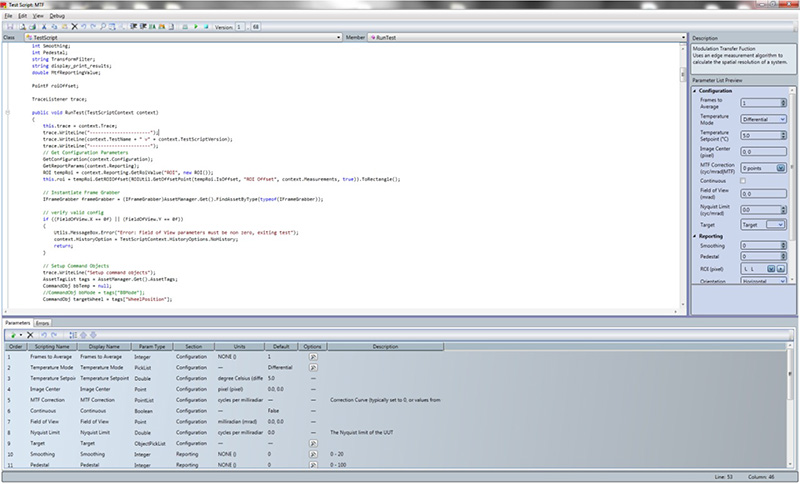 調變轉換函數 (MTF),作為一項評估成像系統清晰度的關鍵指標,常被用於尋找紅外成像系統的最佳聚焦位置,IRWindows 平台允許開發者在測試過程中即時檢視所擷取的影像,並能精細地調整計算 MTF 時所使用的關注區域,以及如平均幀數、影像濾波等其他相關參數,以便獲得最能反映系統真實性能的 MTF 值,此外,IRWindows 還特別提供了一個連續模式功能,在該模式下,操作員可以即時調整 UUT 的參數(例如:鏡頭的聚焦),並同步觀察 MTF 值的變化,從而迅速將系統調至最佳狀態以最大化 MTF 值,相較於傳統僅能透過簡單文字輸入進行參數調整的方式,這種互動式的操作顯著縮短了測試開發的時間,同時,TPS 開發者也可以選擇將此便捷的連續模式整合進最終的 TPS 中,使得現場操作員能夠在 TPS 實際運行過程中,先將系統手動調整至最佳聚焦狀態,然後再執行一次標準的 MTF 測試以擷取並記錄最終的精確結果。