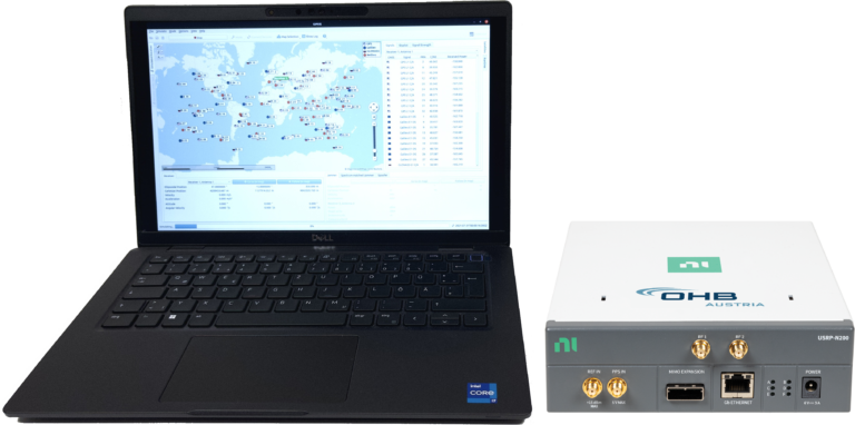 OHB XPLORA One 衛星訊號模擬器(右側硬體為Ettus USRP N200)可透過標準商規(COTS)筆記型電腦(左側)進行操作,其XPLORA Core軟體介面能讓研發工程師便捷地規劃、設定與執行複雜的GNSS模擬場景,高效部署於實驗室或初期車輛整合測試環境。