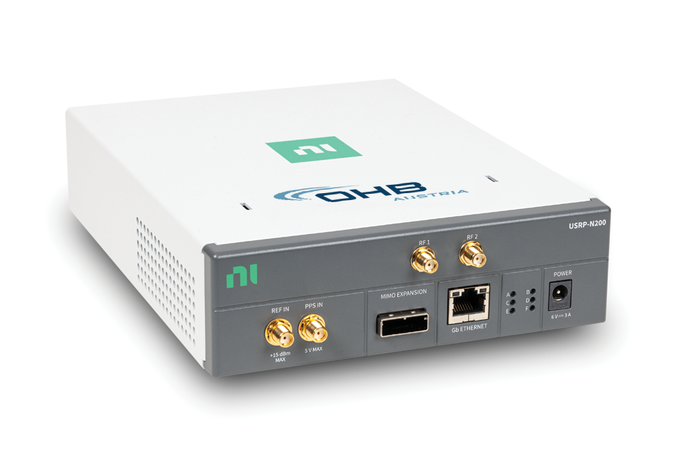 OHB XPLORA One 的硬體單元(如圖Ettus USRP N200所示)提供了1個RF輸出(或選配USRP X300實現2個RF輸出)和必要的參考時脈輸入(REF IN, PPS IN),其高達25 MHz或2x100 MHz的訊號頻寬確保了高傳真度的GNSS訊號模擬。