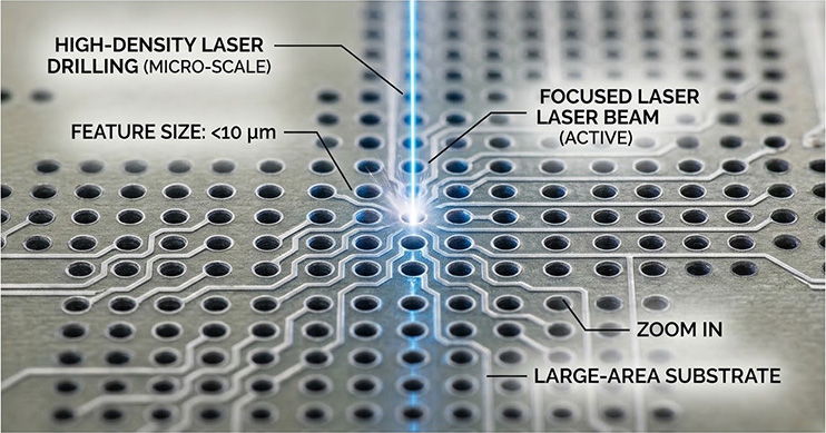 在先進製造版圖中,不論是推動高效能運算(HPC)晶片的「面板級扇出型封裝(Fan-Out Panel-Level Packaging, FOPLP)」,或是次世代高動態對比的 Micro-LED 巨量轉移與修復製程,皆面臨著一個共同的終極挑戰:如何在長寬超過一公尺的超大型玻璃或複合基板上,進行特徵尺寸(Feature Size)僅有數微米(Micrometers)的超高密度雷射鑽孔、切割或剝離(Lift-off)。