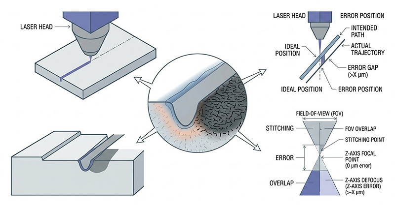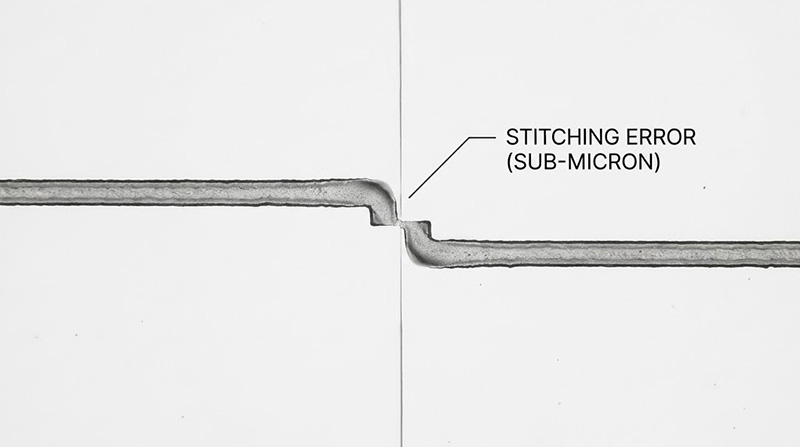 更致命的是「拼接誤差(Stitching Error)」,當雷射需要切割一條長達一百毫米的直線,這條線必然會跨越三個不同的加工區塊,由於底層線性滑台在每次移動後,其定位點都存在微米的絕對誤差,且振鏡在視野邊緣也存在光學校正的殘餘變形;當兩者的誤差疊加時,切出來的長直線在區塊交界處就會產生明顯的「斷差」或「重疊」,如果雷射在重疊處兩次擊發,會造成嚴重的局部熱影響區(HAZ)與材料碳化;如果產生間隙,則會導致線路斷路;傳統依賴軟體補償的方式,根本無法在微米級距內消除這種因為機構分次運動所帶來的物理斷層。