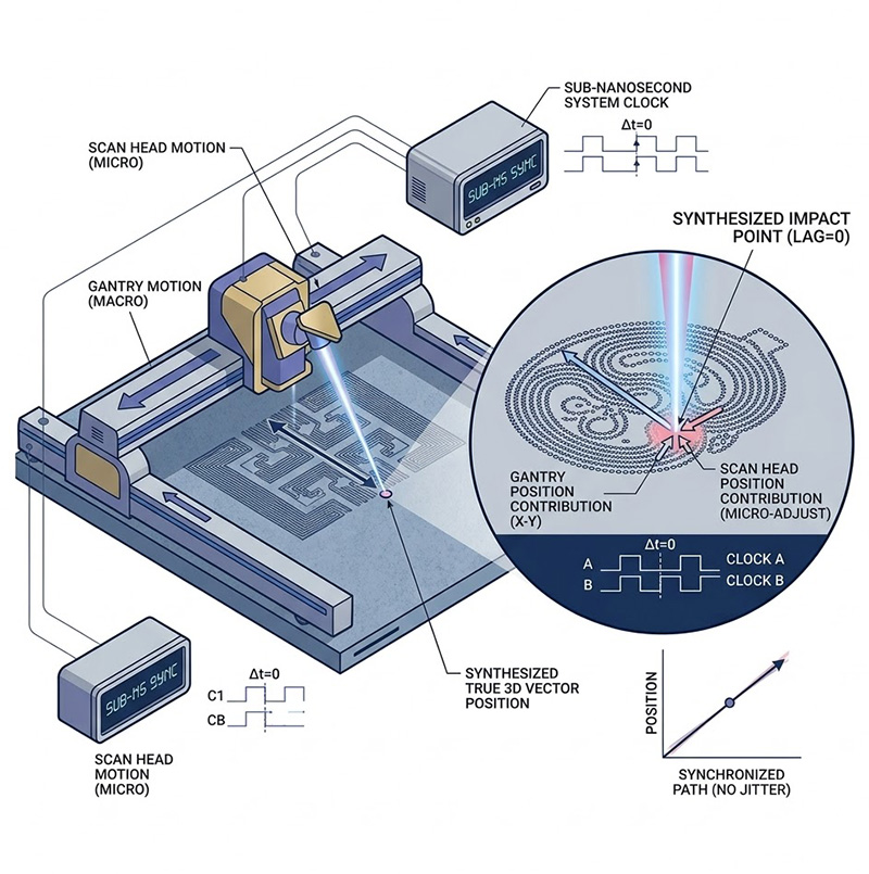 只要這兩個系統的時脈(Clock)之間存在幾微秒(Microseconds)的網路延遲或抖動(Jitter),線性平台與雷射焦點的合成位置就會產生相位差。在每秒數公尺的高速掃描下,一微秒的延遲就會在材料表面造成數微米的空間錯位,此外,雷射脈衝的觸發如果無法精準得知這兩個系統「合成後的真實三維向量位置」,就會在加減速區域產生能量分佈不均的問題,如何在單一控制核心內,達成巨大龍門與微小振鏡的「次奈秒(Sub-nanosecond)」絕對同步,並消除傳統雙鏡片振鏡帶來的光斑畸變,是突破大面積加工極限的最後一道天險。