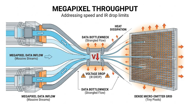 當陣列規模從 512x512 擴展至 1024x1024 甚至 1536x768 時,像素總數增加了 4 倍至 4.5 倍,若要維持 200 Hz 的全幀率(Full-frame)更新以避免時空採樣偽影,讀入積體電路(RIIC)的數位資料傳輸量將飆升至每秒 400 MB 以上,此外當百萬個微電阻發射器同時模擬高溫場景時,峰值電流消耗可高達數十安培,龐大的電流在大型晶片基板上流動會產生嚴重的全域電壓降(IR Drop),導致畫面中心的實際驅動功率低於邊緣,進而引發難以透過單純演算法補償的全域輻射非均勻性。