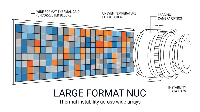 大尺寸陣列要求投影區域具備極高的輻射均勻度(未校正前通常存在 10% 以上的非均勻性),實務上針對 LWIR 波段進行 NUC 需依賴大尺寸的非冷卻微測輻射熱計(Microbolometer)攝影機,然而面對 1536x768 這種超寬視野,攝影機鏡頭的光學漸暈(Vignetting)與感測器本身的熱漂移(Thermal drift)會被急遽放大,在進行稀疏網格(Sparse grid)的像素級迭代擷取時,這些大面積的光學與熱力學變數會嚴重汙染校正矩陣,導致高溫與低溫區段的熱解析度(Thermal resolution)失真,難以在大動態範圍內維持嚴格的微克耳文級均勻性。