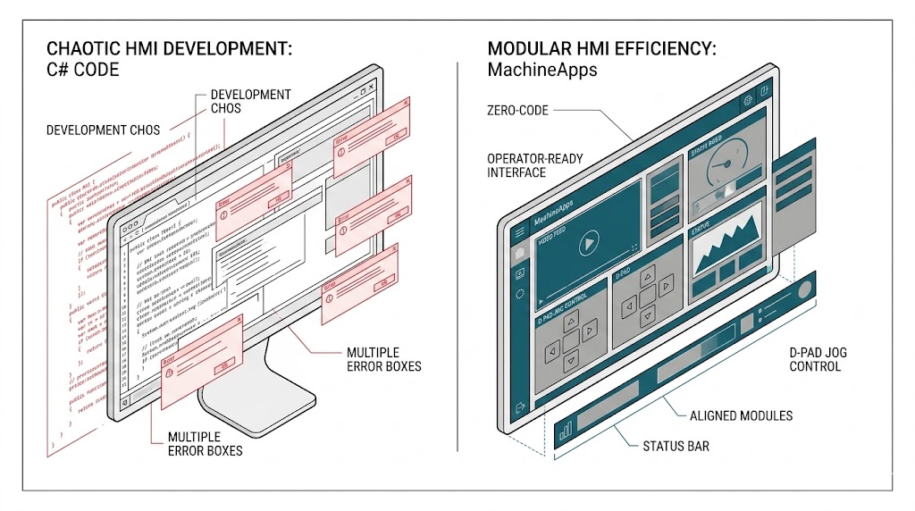 圖解對比混亂的傳統C# HMI開發(多錯誤)與高效的MachineApps模塊化HMI(零代碼、界面整潔、操作員就緒)。