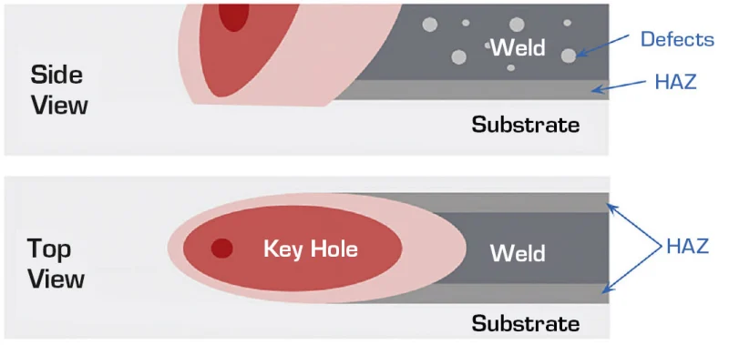 雷射接合技術相較於其他材料接合技術,展現了顯著的優勢,與傳統的焊接或接合方法(例如,金屬惰性氣體焊接、鎢極惰性氣體焊接等)不同,後者往往會產生大量微粒,且通常需要二次加工或清潔程序,雷射接合則是一個潔淨的製程,此外,經過適當控制與改良後,高強度的雷射接點能夠以高速產生,當雷射接合透過自動化設備執行時,這些接點不僅具有高度的可再現性、極高的精密度,同時在視覺上亦相當美觀,自動化雷射焊接製程亦能對接點的熱影響區(HAZ,Heat Affected Zone)進行嚴格控制,如圖 2 所示,最後,雷射接合為異質材料的接合開創了新的契機,為器材製造商帶來了全新的可能性¹。