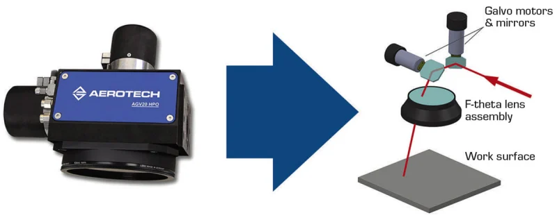 雷射掃描振鏡通常由至少兩個高動態馬達(通常稱為振鏡馬達 (galvanometers))組成,這些馬達與針對雷射源具有最佳化反射率的鏡片耦合,馬達亦採用高解析度數位編碼器,使其角位移可以透過伺服控制迴路進行控制,鏡片引導雷射光束穿過一個 F-theta 透鏡,該透鏡能將鏡片的角度位置線性化為光束在透鏡視野範圍內的位移,如圖 4 所示,在雷射焊接的應用情境中,雷射掃描振鏡提供了數項優勢,包括: