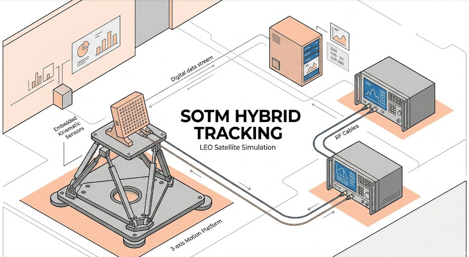 為評估 SOTM 系統對真實衛星軌跡的追蹤能力,最高階的測試方法是採用硬體迴路(HIL)架構,在此架構中,兵推電腦會即時生成衛星的雙行軌道參數(TLE)數據以及載具的運動軌跡,並同步將物理姿態指令發送給底層的運動平台,同時將預期的射頻訊號變化發送給微波量測儀器。