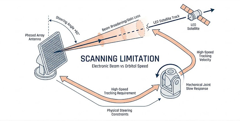 為了解決這個掃描極限,工程師通常會為 AESA 加上一個機械式的旋轉基座,然而純機械轉台的伺服馬達受限於實體的物理慣性,其轉動角速度與角加速度相對遲緩,根本無法應對載具瞬間的微小震動或低軌衛星在天頂正上方快速掠過時的極端角速度要求。