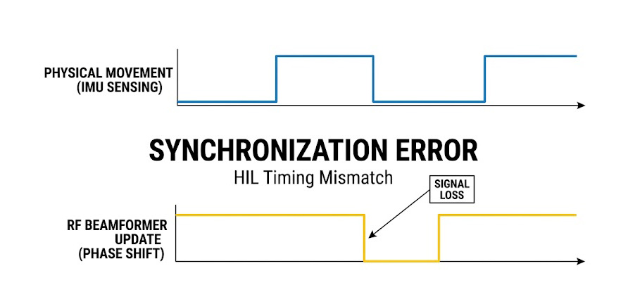 這裡存在一個致命的時序同步問題,運動平台的機械伺服驅動系統與射頻分析儀器的數位控制介面,通常運作於完全不同的通訊協定與時脈基礎上,如果兵推系統發出一個「車輛瞬間向左傾斜 10 度」的指令,運動平台因為通訊抖動與機械慣性,延遲了數十毫秒才到達指定位置;但 SOTM 終端的 IMU 卻在運動平台移動的過程中提前或延後感知到變化,進而錯誤地更新了波束方向。