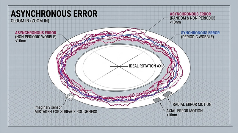 在現代壓印微影滾筒的輪廓檢測中,待測物的重量可能高達數十甚至上百公斤,新規範要求承載這些重物的線性與旋轉複合平台,在進行長達數百毫米的垂直(Z 軸)爬升,並同時進行每秒數轉的高速連續旋轉時,其旋轉中心的「徑向誤差運動(Radial Error Motion)」與「軸向誤差運動(Axial Error Motion)」必須被嚴格控制在五十奈米以內,更關鍵的是「非同步誤差(Asynchronous Error)」,即那些不會隨著旋轉週期重複出現的隨機性偏擺,必須低於十奈米,因為在白光干涉儀或共焦感測器眼中,任何大於十奈米的非同步機械晃動,都會被感測器誤判為待測物表面的「粗糙度」或「微小瑕疵」,直接導致良品的誤殺(False Reject)。