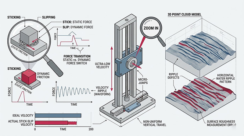 本圖展示精密滑台極低速下因摩擦力轉換產生的「黏滯-滑動(Stick-Slip)」效應,微觀速度漣波會導致資料瑕疵,在 3D 模型留下水平水波紋,嚴重影響量測準確度。
