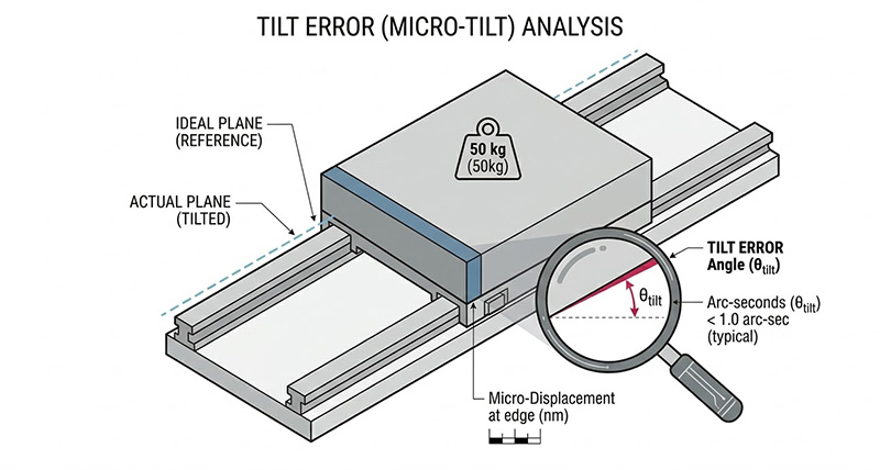 此圖放大了精密滑台的傾斜誤差,顯示了滑台的微小傾斜角(在角秒量級),以及理想平面與實際平面之間的偏差,這直接影響測量或定位精度。