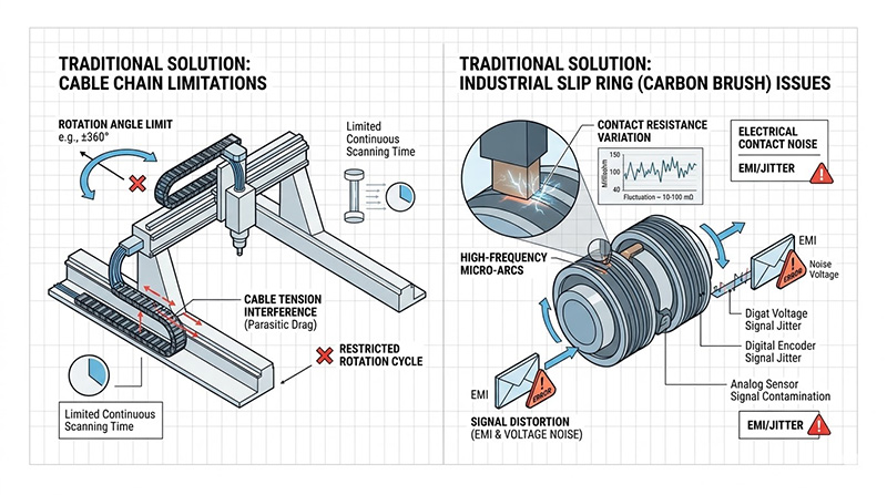 本圖表對比了傳統電纜拖鏈(左)和工業滑環(右)在旋轉介面上的技術局限,展示了電纜限制的有限角度和拖曳力矩,以及碳刷滑環高速摩擦產生的接觸電阻波動和 EMI,兩者皆導致訊號失真。