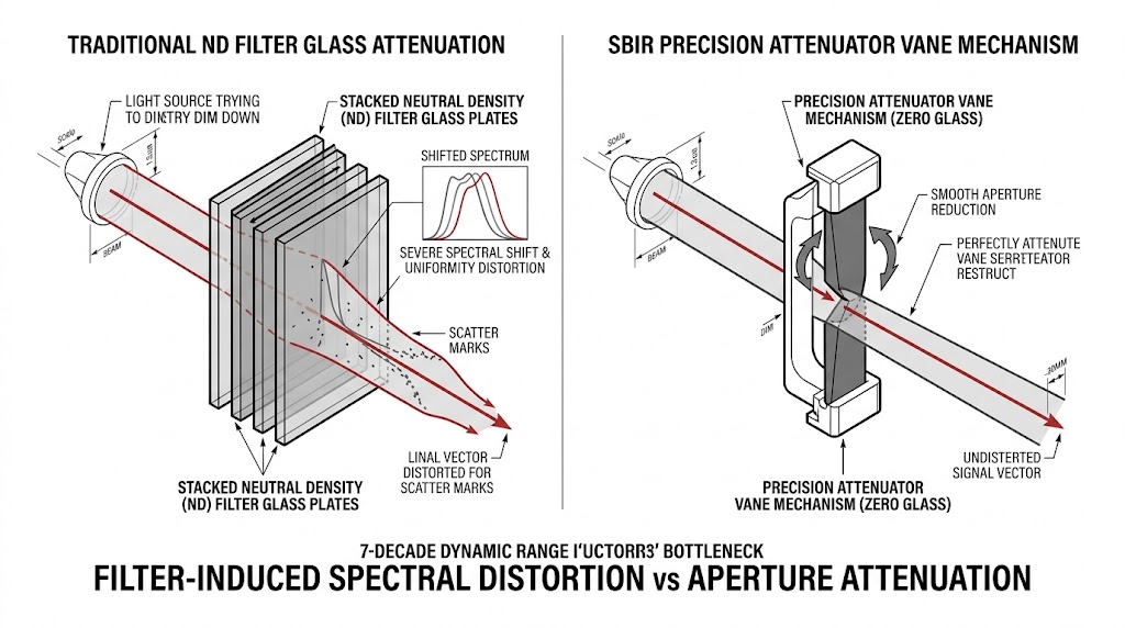 傳統的測試系統為了達到微光級別,通常會依賴多層的中性密度濾光片 (Neutral Density Filters) 來進行物理衰減,然而要在單一系統中涵蓋超過七個數量級的動態範圍,強行疊加多片衰減濾光片不僅會引發嚴重的光譜畸變 (Spectral Shift),更會破壞光束的空間均勻度,更致命的是,對於需要在極端明暗之間快速切換的動態測試而言,頻繁依靠機械模組抽換濾光片,其遲滯時間完全無法滿足現代自動化量產與連續性能演算法的驗證需求。