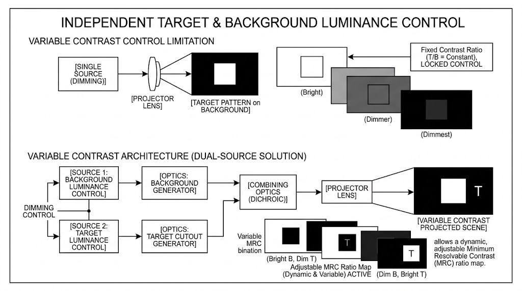 實戰中的微光環境極其複雜,目標物與背景之間往往只存在極微小的反射率差異,測試 LLTV 相機的關鍵不僅在於「絕對亮度有多暗」,更在於「最小可解析對比度 (Minimum Resolvable Contrast, MRC)」,傳統的光源積分球只能將整個視場 (FOV) 一起調暗或調亮,無法分離目標與背景的照明,如果測試系統缺乏「可變對比度 (Variable Contrast)」的雙重照明架構,工程師便無法模擬出「暗背景下的微光目標」或「亮背景下的暗目標」,導致無法真實評估無人機相機在複雜地形中的極限對比探測能力。