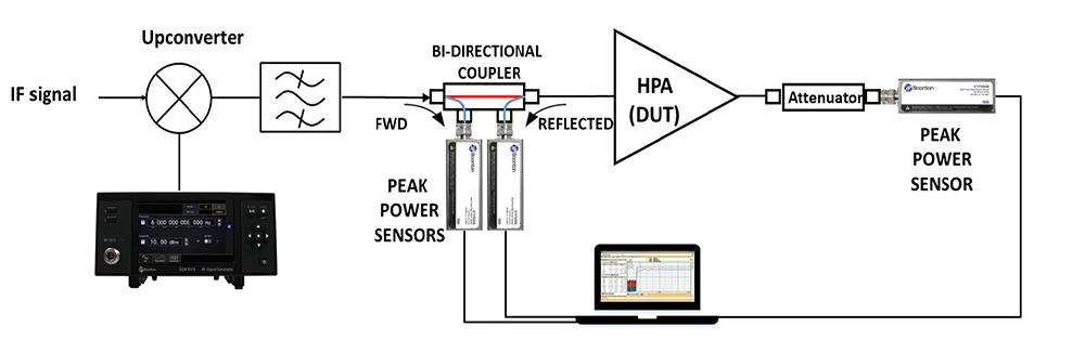 圖五展示了使用 Boonton SGX1000 訊號產生器作為 LO 替代,並搭配 Boonton RTP5000 峰值功率感測器,以評估上變頻鏈路中高功率放大器 (HPA) 效能的測試配置。
