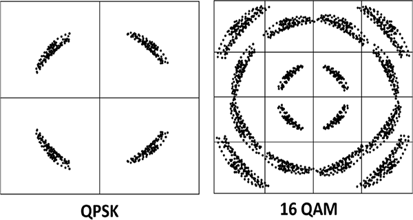 圖四:相較於 QPSK 調變對於相位雜訊有較高的耐受度,相同程度的相位雜訊(角度旋轉)在高階調變方案中則會引發符碼錯誤。