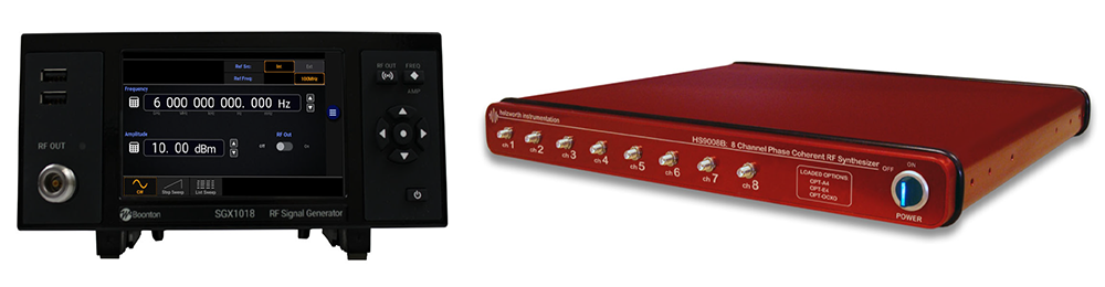 訊號源的產品型式相當多元,最常見的是配備單一射頻輸出埠的訊號產生器,然而,若期望由單一設備同時產生上行與下行鏈路所需的 LO 頻率,那麼採用多通道合成器可能會是更實用且有效率的選擇,圖六展示了 Boonton 及其姊妹品牌 Holzworth 所提供的這兩種產品型式。