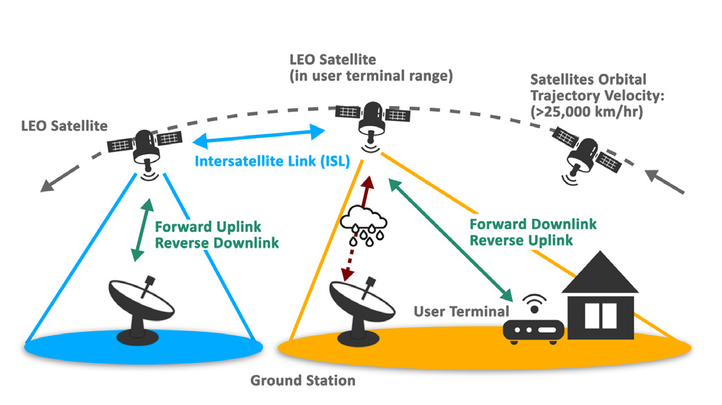 圖 2:LEO 系統的典型架構及其各種組成元件,從衛星酬載到使用者終端。
