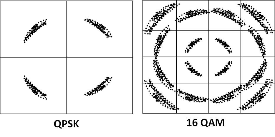 圖 4:QPSK 調變對相位雜訊有較高的耐受性,然而相同程度的相位雜訊(角度旋轉)在高階調變方案(如 64-QAM)中則會引發嚴重的符碼元錯誤。