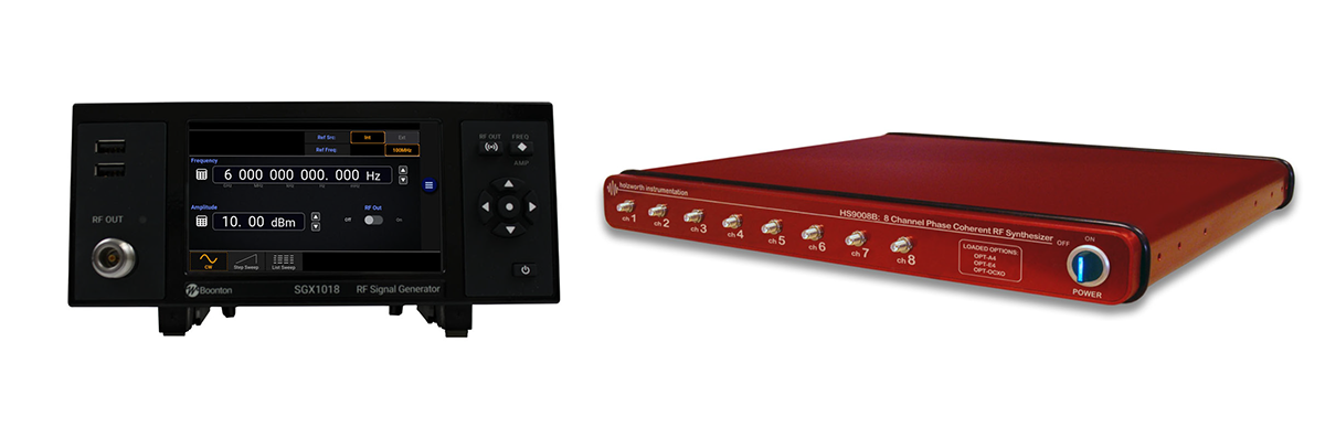 訊號源有多種形式可供選擇,最常見的是配備單一射頻輸出埠的訊號產生器,然而,若期望從單一設備同時產生上行與下行鏈路所需的 LO 頻率,多通道鎖相合成器可能會是更實用且高效的選擇,這種儀器不僅節省了測試台空間,更能確保兩個輸出通道之間具備精確的相位同調性,這對於某些需要相位關聯性的進階測試情境至關重要,圖 6 展示了 Boonton 及其姊妹品牌 Holzworth 所提供的這兩種儀器外型。