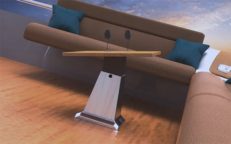即使在波濤起伏的海上航行,船艙內的桌面(如圖所示)也能透過主動動態穩定系統保持絕對水平,確保杯具安穩放置,提升乘客的舒適度與奢華體驗。此技術對於高端遊艇、客輪及重視航行品質的船舶至關重要。