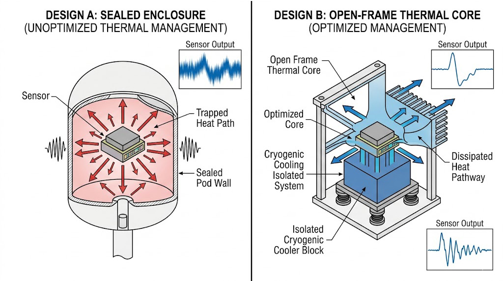 示意圖對比密封外殼(左)與優化開放式架構(右)對感測器的影響。後者藉由隔離式低溫冷卻塊有效散熱與減震,產出乾淨訊號。