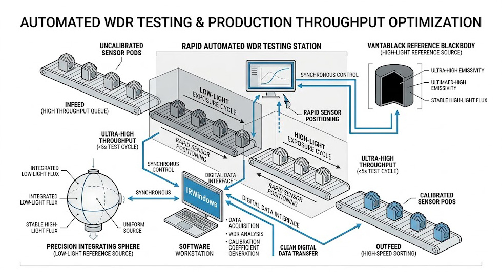 示意圖中展示了快速自動化 WDR 測試站如何優化產能,由 IRWindows 軟體工作站同步控制精密積分球(低光參考源)與 Vantablack 參考黑體(高光參考源),未校正感測器模組快速通過低光與高光曝光循環,實現小於 5 秒測試週期的超高產量,並確保乾淨的數位數據傳輸。